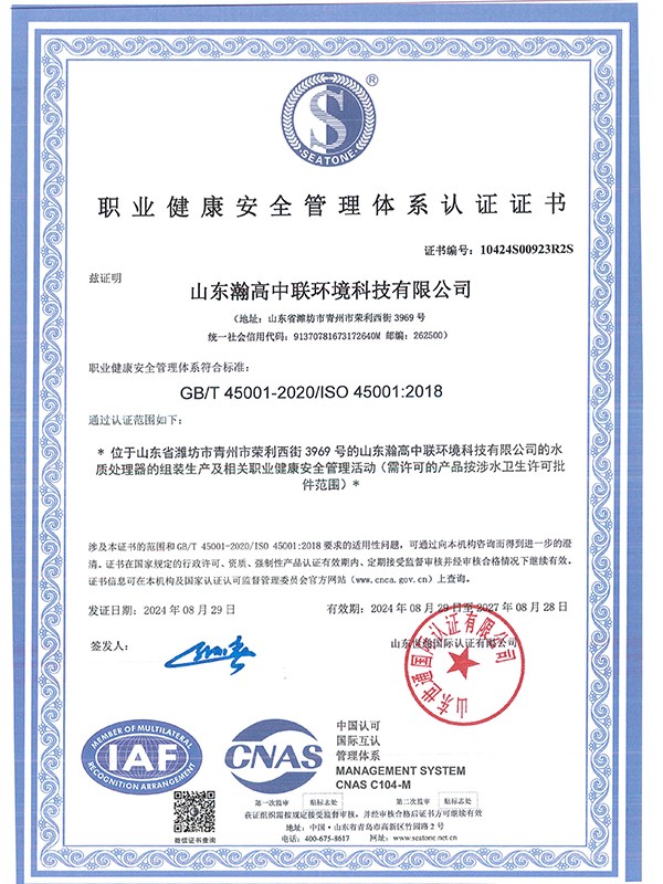 山東瀚高中聯環境科技有限公司始建于2008年,是一家較早從事開發、研制、銷售、服務于一體的高新科技型企業。該公司位于青州市高新技術開發區榮利西街3969號,地理位置優越,交通便利,占地面積30000余平方米,擁有現代化標準廠房15000余平方米,注冊資金3000萬元,固定資產2億余元,軟硬件配套設施齊全。長年專致于純凈水設備、反滲透水處理設備、無負壓供水設備、海水淡化設備、中水回用設備及灌裝殺菌凈化一體化設備的研發、生產和銷售,與眾多的科研院所合作,設有獨立的設計研究機構。積累了豐富的水處理技術制造經驗,擁有先進的加工設備,齊全的檢測手段,完善的質保體系以及合理的售后服務。十幾年來始終秉承“誠信為先 品質為本”的理念,我們同客戶共成長,公司經過不斷創新科技技術,市場產品競爭優勢明顯,產品銷往國內外,獲得了良好的市場口碑,奠定了業內的地位,深受用戶好評。